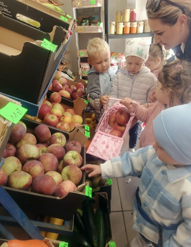 Najstarsza grupa żłobkowa wybrała się także na krótką wycieczkę do sklepu, by samodzielnie kupić jabłuszka. Dzięki temu dzieci mogły praktycznie poznać codzienny rytuał zakupów – od wybierania owocu po obsługę klienta – a także dbać o zasady bezpieczeństwa podczas zakupów.