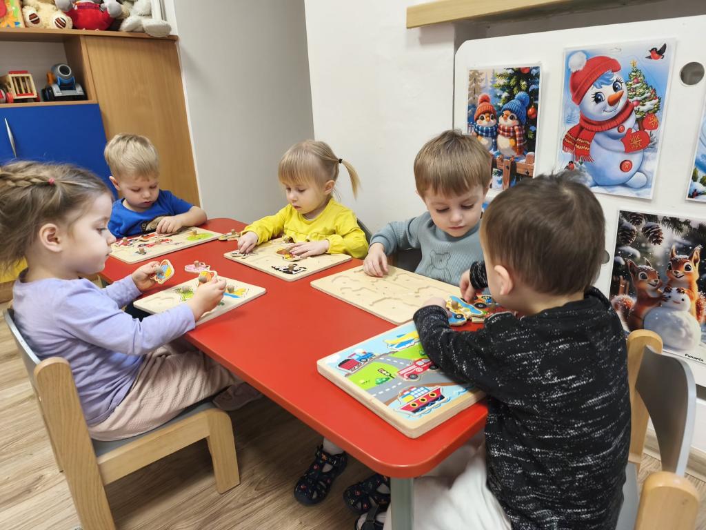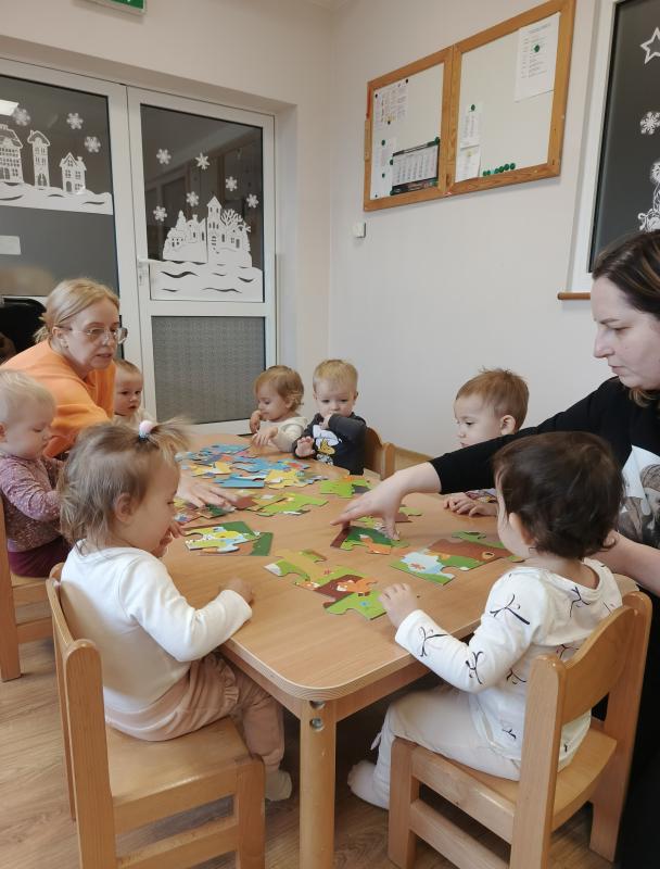 Maluchy z ogromnym zaangażowaniem układały puzzle, dopasowywały kształty oraz rozwiązywały proste łamigłówki, dostosowane do ich wieku i możliwości. Takie aktywności nie tylko sprawiły dzieciom wiele radości, ale także wspierały rozwój koncentracji, cierpliwości i współpracy w grupie.