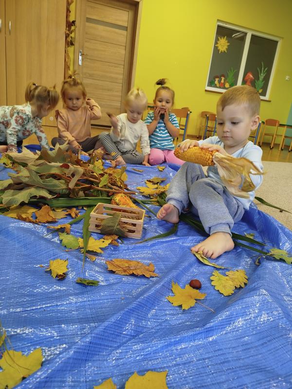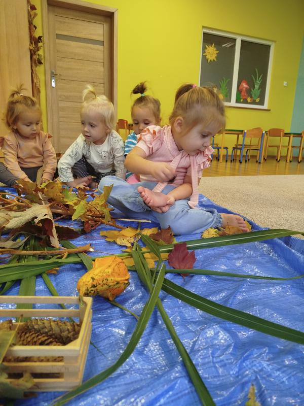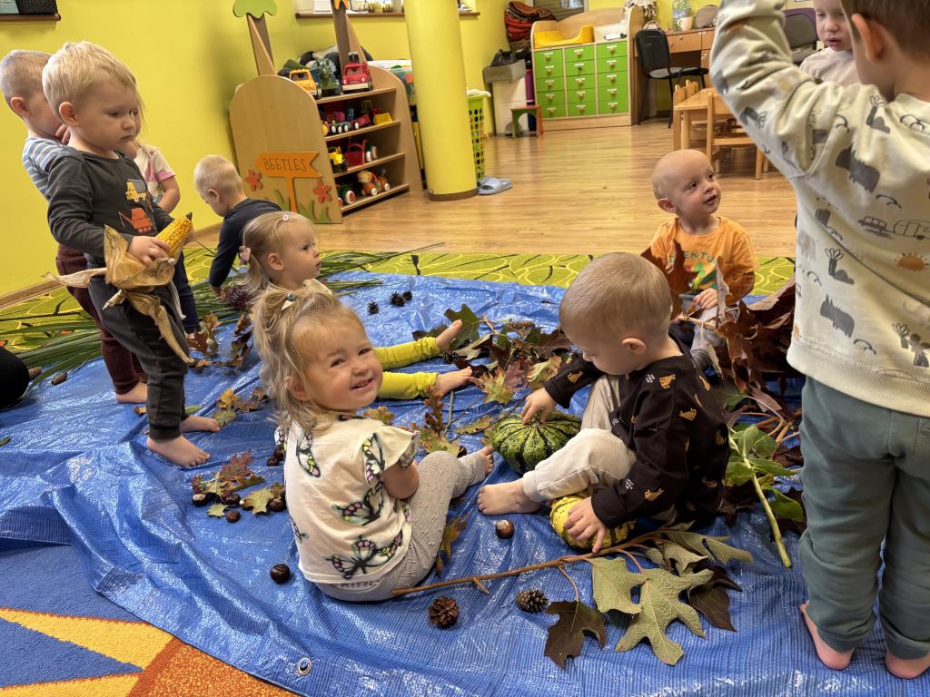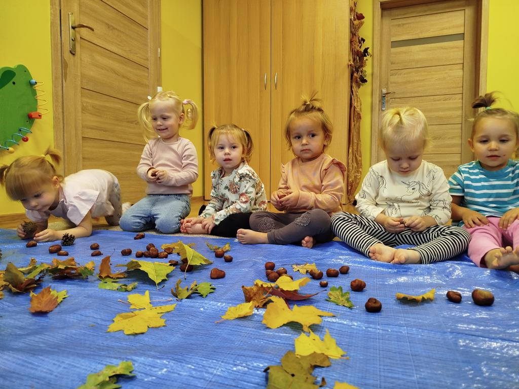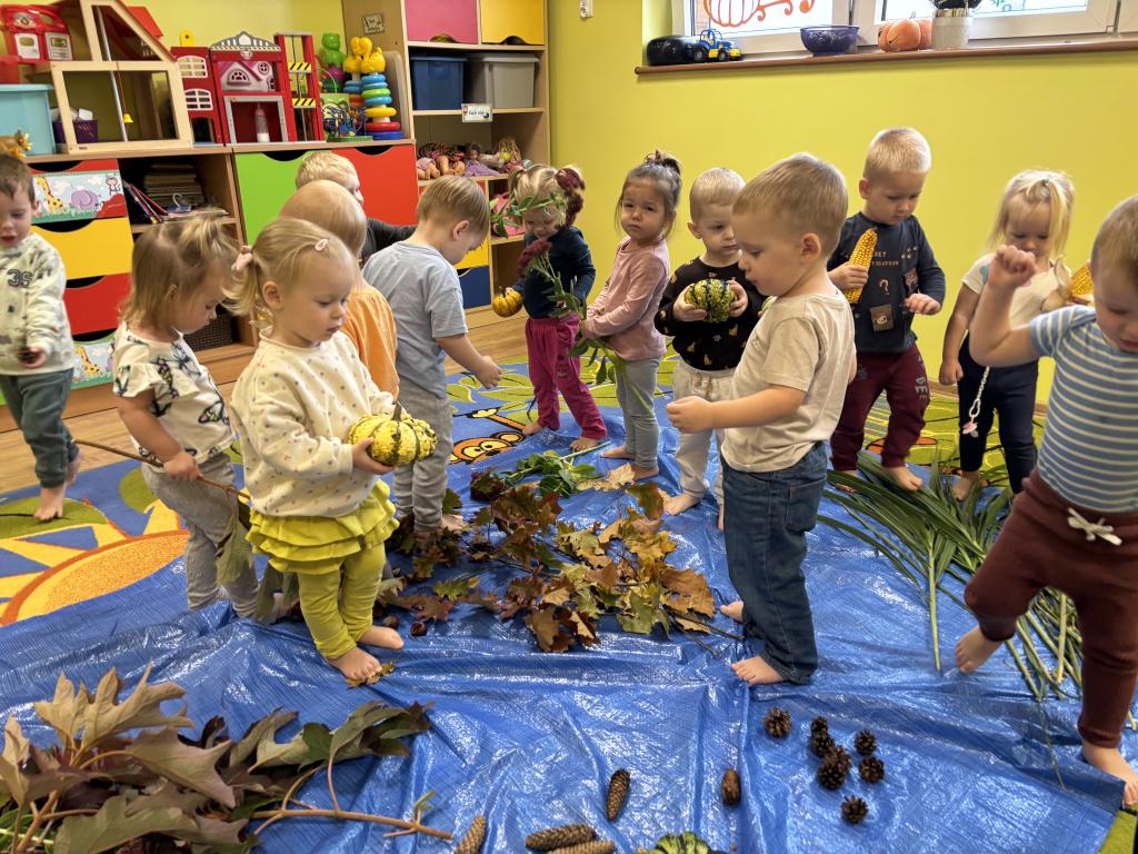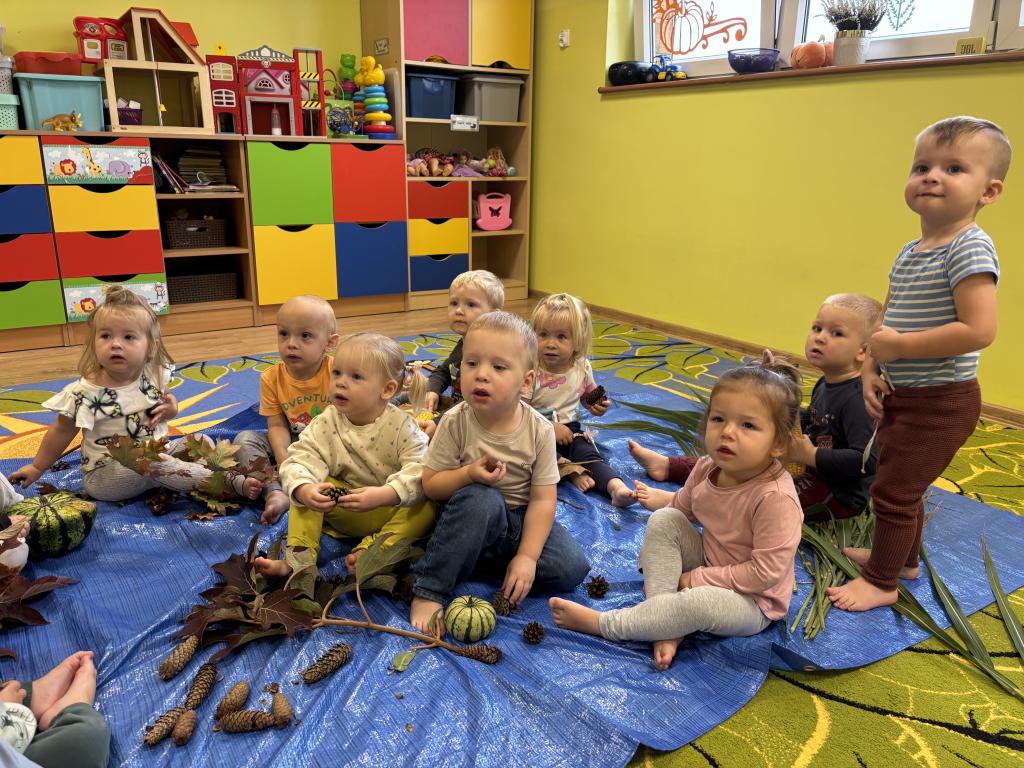 Jesień to wyjątkowa pora roku, pełna barw, zapachów i różnorodnych faktur. W naszym żłobku opiekunki postanowiły wykorzystać bogactwo darów jesieni, aby zorganizować dla dzieci zajęcia sensoryczne, wspierające rozwój poznawczy, emocjonalny i motoryczny maluchów. Podczas codziennego pobytu w żłobku dzieci uczestniczyły w wielu aktywnościach angażujących wszystkie zmysły. Jednym z głównych punktów zajęć był tor sensoryczny, przygotowany z naturalnych materiałów – liści, kasztanów, szyszek, żołędzi. Dzieci, chodząc po torze boso, mogły doświadczać różnorodnych faktur, temperatur i kształtów. Tego typu zabawy mają ogromne znaczenie dla rozwoju integracji sensorycznej – pomagają dzieciom lepiej poznawać własne ciało, rozwijać koordynację ruchową oraz świadomość przestrzenną. Kolejnym etapem zajęć były działania plastyczne z wykorzystaniem darów jesieni. Dzieci tworzyły kolorowe kompozycje z liści, ozdabiały kartki kasztanami i szyszkami, a także malowały farbami. Takie aktywności nie tylko rozwijają zdolności manualne, ale także wspierają kreatywność, koncentrację i ekspresję emocjonalną najmłodszych. Podczas zabaw sensorycznych opiekunki dbały o to, by każde dziecko mogło eksperymentować we własnym tempie, rozwijając zmysł dotyku, węchu i wzroku. Dzięki bezpośredniemu kontaktowi z przyrodą maluchy miały okazję obserwować zmieniający się świat, co sprzyja rozwijaniu ciekawości poznawczej oraz wrażliwości na otaczające środowisko. Zajęcia przebiegały w atmosferze radości i zaangażowania. Dzieci z uśmiechem odkrywały nowe doznania, a każda wspólna aktywność stawała się dla nich okazją do nauki poprzez zabawę. Takie doświadczenia mają kluczowe znaczenie w wieku żłobkowym, kiedy rozwój zmysłów, motoryki i emocji tworzy fundament dalszej nauki i poznawania świata.
